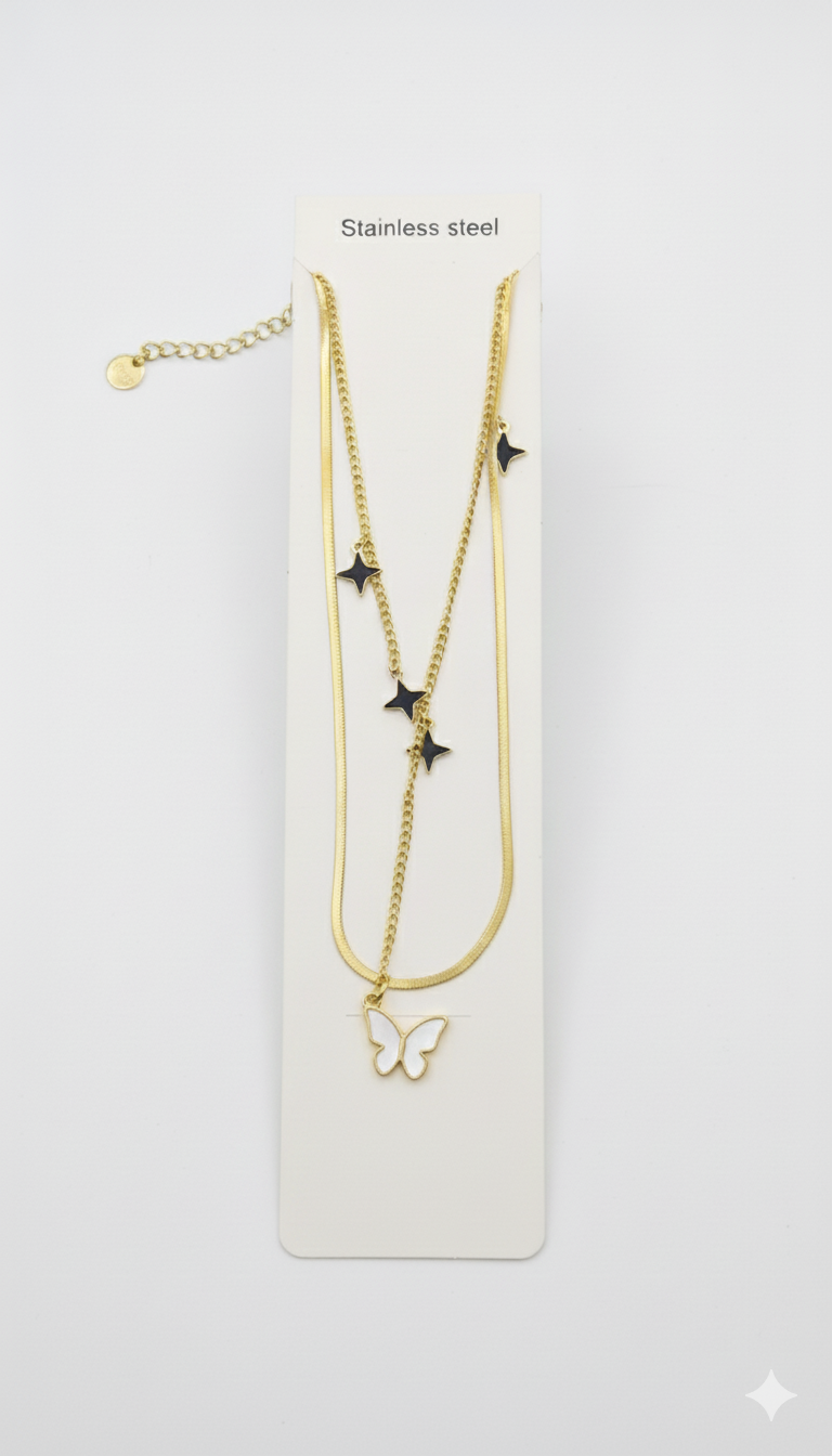 A fashionable, gold-toned double-layered necklace. The shorter strand features a small star charm, while the longer strand features a delicate butterfly charm. This set is perfect for achieving a trendy, layered look.